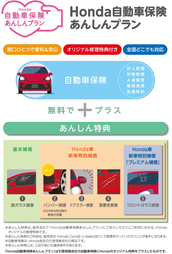 Honda Cars系列店での契約だからこそ、修理やサービスがスムーズです。Honda純正部品での修理が保証され、車の品質を維持できます。また、事故時のサポートや専用デスクによる対応が充実。保険とカーライフが一体となったトータルサポートが特徴で、安心して利用できます。アフターケアもしっかりしています。