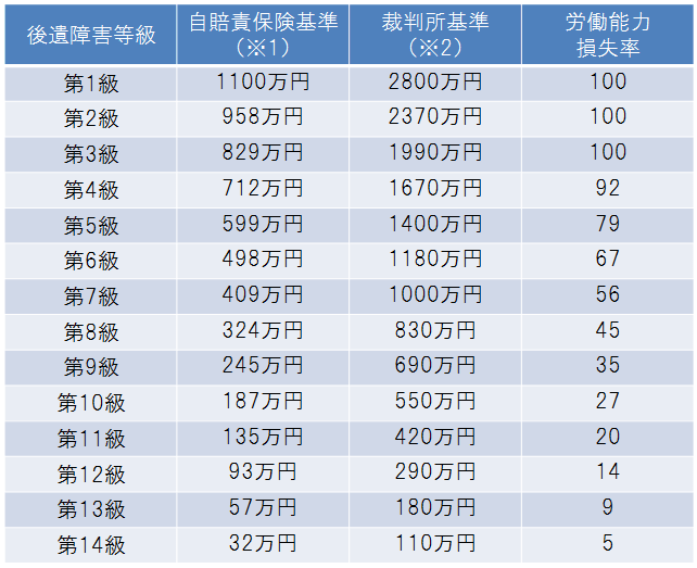 | 7級 | 片目が失明、または手の機能を完全に喪失 | 1,250万円 |