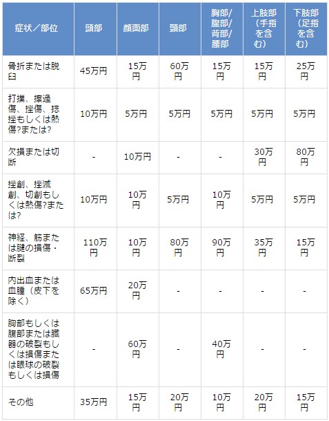 支払われる金額は、保険会社やプランの設定によって異なりますが、通常、死亡時には100万円~300万円、後遺障害は等級に応じて数10万円~300万円、入院時には1日あたり5,000円~10,000円、手術時には5万円~20万円程度の補償が設定されています。