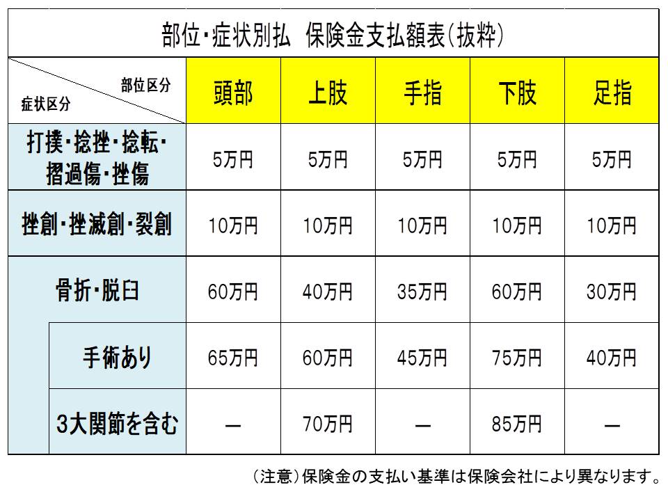 特に1級や2級の重度な後遺症には高額な保険金が支払われ、例えば1級で900万円、14級で75万円といった具合である。このように等級制度に基づいた支払いが行われるため、実際の補償額は傷害の深刻度に大きく左右される。